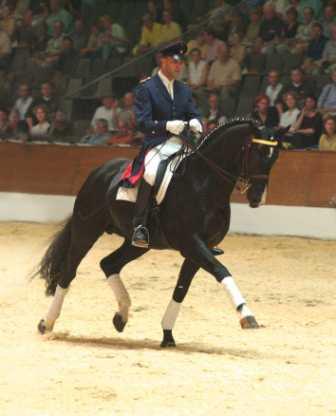 At his performance test in Adelheidsdorf in 1998 Rotspon came first in the overall placing and first in dressage. He has a character and temperament score of 9. A conformation score of 8, a jumping ability score of 8 and rideability scores of 9 and 10. He has an outstanding walk score of 8, (the average is 6.3) his trot is also very high of 8.33 (against the average of 6.38). His canter score of 9 puts him again well above the average. Rotspon is very elegantly made with a noble black colour with a lot of expression and great appearance. He is big-framed with good riding horse points, a lot of substance and correct conformation. He has high rideability, quality basic gaits and a very good attitude. Besides his extraordinary dressage he also has a good jumping result. Apart from his famous sire, Rubinstein 1 Rotspon also has a great pedigree on his dam side; Argentan by Absatz and Paragona by Pik Bube.