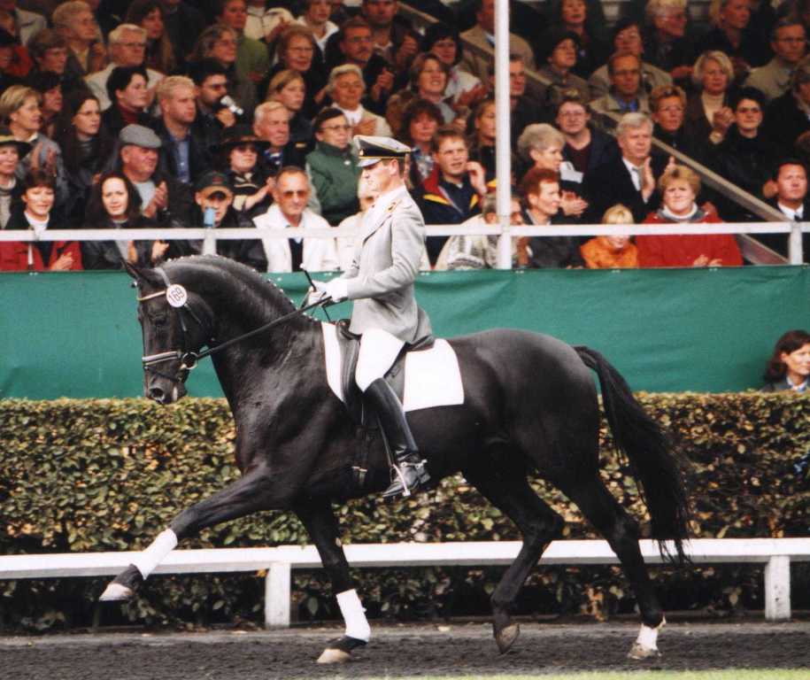 Don Frederico’s sire, Donnerhall, is considered one of the most successful dressage stallions of the world. In 1986 he was the DLG champion in Hanover. He had many wins in Grand Prix, Grand Prix Special and freestyle classes at international level, and in 1994 he won the German Dressage Championships in Mannheim. He won the team World Championships and the individual bronze medal in The Hague under his permanent rider Karin Rehbein. In 1997 he won team gold and individual bronze at the European Dressage Championships in Verden. In 1998 he was once more included in the German world championship team and was a member of the gold medal team of Rome where he attained fourth place in the individual results. Donnerhall won the World Cup European League as well as being the Oldenburg dressage stallion of the year in 1997 and 1998 respectively. At the end of 1998 he farewelled himself from competition sport ‘fresh as a daisy’ at 17 years of age. His total winnings amounted to DM 341,800 (by the end of 1994 only).