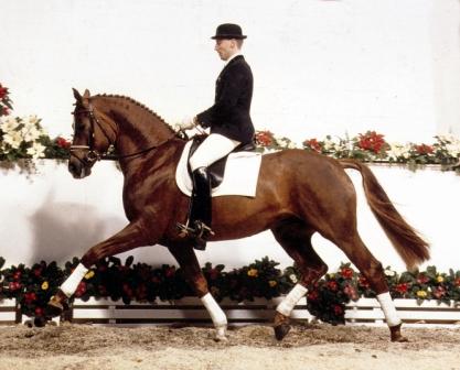 Performance record:  Alabaster did a very good stallion test in Adelheidsdorf in 1992, where his aptitude for dressage became very evident. He achieved the title of federal champion of 5 year old dressage horses in Warendorf in 1994. He is shaped by the foundation sire Abglanz, who established the radiance and beauty of the Trakehner in the Hanoverian breed after World War 1. Alabaster was successful as a sports horse up to Grand Prix level and promoted up to advanced class.
