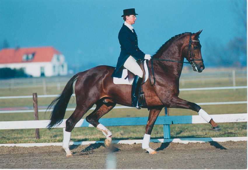 In 1999 he was in the equestrian press characterised as “The year of Jazz”. A foal by Jazz x Ariban was the winner at the Arnhem Championships. Eight of his sons were referred to Den Bosch for the 1998/99 stallion inspections. A Dutch Champion at the Pavo Cup was by Jazz (Jazz x Ulft). Another daughter became Dutch national champion as a 3 yo. (Jazz x Triton). A three year old mare (Jazz x Wolfgang) became runner up for jumping in Ermelo in 1998. One of Jazz’s sons (Jazz x Romadour 11) passed the national German test. At the VSN/FSP in Ermelo in 1999/2000 Jazz had 10 of his offspring in the finals. At the pre-selection for stallion licensing 1999/2000 five sons were sent to Den Bosch. In the 2000/2001 Cup Final in Ermelo he was the stallion with the most foals in the finals. Patser, a 4 yo son of Jazz was Champion. At the World Championship for young dressage horses in Verden two of Jazz’s offspring were selected. In the meantime Jazz has four accepted sons in the KWPN, Norway, Olivi, Riant and in Germany Jazz Time. He makes excellent combinations with all kinds of mares and his offspring is sold for record prices. In January 2002 he was accepted in the Oldenburg Studbook. At the pre-selection for the stallion show 2002/03 there were 4 sons sent through to the second selection phase in ‘s Hertogenbosch. At the Pavo Cup Finals 2003 Robin Hood by Jazz x Zep won with 81 points, defeating Roselma by Jazz x Fruhling who scored 80 points. For the pre-selection of stallions 2003/2004, 6 sons were promoted to go to the second selection in Den Bosch. Jazz is father of many accepted stallions by the KWPN and he is increasingly stronger in the mare lines. He passes on his sport and breeding qualities to his offspring and this shows out every time his progeny competes. Jazz has a breeding index of 173 points with 95% accuracy. He is at the top of the dressage stallion index.