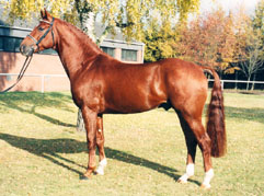 After winning the licensing and the conquest of the Federal Championships of the German Riding Horse in 1994, this typical son of Weltmeyer only missed the ‘triple crown’ by ½ point in the total score as runner-up in the performance test. Wolkentanz is ‘champion-type’ and of extra class, with spotless conformation, good muscles and outstanding expression. This excellent Weltmeyer son has flowing, expressive, rhythmical movements along with correct conformation and a wonderful mind. He will sire dressage horses of undisputed excellence. He has been promoted up to advanced class in sport. Without a shadow of a doubt Wolkentanz represents top dressage ability from Germany.