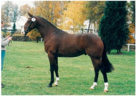 Longchamp’s remarkable features are a big frame, attractive conformation, and an excellent rideability. He has a superb temperament, and exceptional movements. Longchamp was Reserve Champion of 3 year old Riding Horses in Germany, and Vice Champion of the performance test 1995, winning the dressage phase, and winner of the bronze medal at the Federal Championships at Warendorf 1996. Following great success in dressage horse competitions at the elementary and intermediate level (eight wins) in 1997 and 1998 he qualified for the federal German dressage horse championships in both years, coming fifth in the 1998 finals. Longchamp has several wins in ‘Prix St George’ dressage competitions.