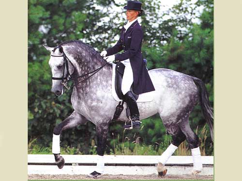 Junior is the name of one of The Netherland’s greatest dressage talents. He is naturally the successor of his father Uniform - the grey stallion of whom countless children do very well in dressage competitions. As a 3 year old this was the sort of thing said of Junior: ‘as a riding type stallion, Junior is a fair, reliable and well-balanced stallion. The grey pays a lot of attention to work. The basic movements have lot of space, power, balance, and suppleness. His collection is excellent. As a dressage horse Junior has a lot of talent and gives his rider a very good feeling. As a jumping stallion, he has sufficient talent. At the stable and in work his temperament is very good’. He received performance scores of 7.5 walk, 8 trot, 8 canter, 8.5 dressage test,character, 9 behaviour, 9 trainability.