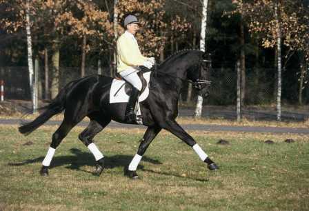 Once again a son of Escudo 1 wins his performance test. Earl, a big impressive black stallion, convinced in all criteria of the test, especially the rideability and his willingness to work, which needs to be greatly emphasized. (See information on Escudo 1 and Lanthan, Earl’s damsire under their sections.)