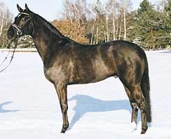 Sire Weltruhm is one of Weltmeyer’s oldest sons and was placed a federal championship contestant. His progeny from the first few crops were convincing all along the line. Apart from Woronow, Weltruhm also presented Weltblick who was approved in 1998. The damsire Argentan 1 became the strongest disseminator of the Absatz blood in contemporary horse breeding. He distinguishes himself as a purveyor of international show jumpers like Itschutschuna or the 1983 World Cup champion Aramis and the thrilling show mares such as Arabella, Aragonia and Ascona. The granddam Windroschen was clearly bred for show jumping. Woronow is a pretty, black, elegant and impressive Weltmeyer grandson. He had excellent character and high rideability right from the beginning of daily training onwards. His outstanding show jumping ability was especially shown in performance competitions. Woronow went through his performance test in 1998 in Adelheidsdorf. The final score of the performance test had to be figured because he couldn’t finish the test due to injury.